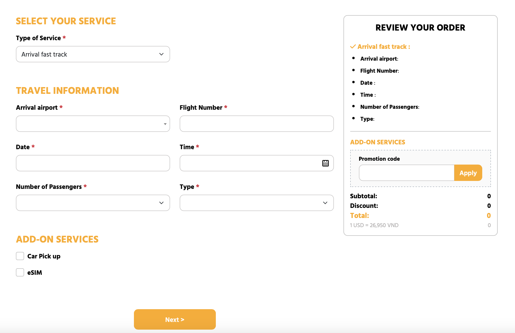 Upon your arrival at any major Vietnam airport, a professional staff member will welcome you at the gate and escort you through a dedicated priority lane.